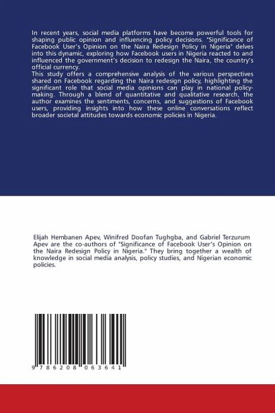In recent years, social media platforms have become powerful tools for shaping public opinion and influencing policy decisions. "Significance of Facebook User's Opinion on the Naira Redesign Policy in Nigeria" delves into this dynamic, exploring how Facebook users in Nigeria reacted to and influenced the government's decision to redesign the Naira, the country's official currency.This study offers a comprehensive analysis of the various perspectives shared on Facebook regarding the Naira redesign policy, highlighting the significant role that social media opinions can play in national policy-making. Through a blend of quantitative and qualitative research, the author examines the sentiments, concerns, and suggestions of Facebook users, providing insights into how these online conversations reflect broader societal attitudes towards economic policies in Nigeria.