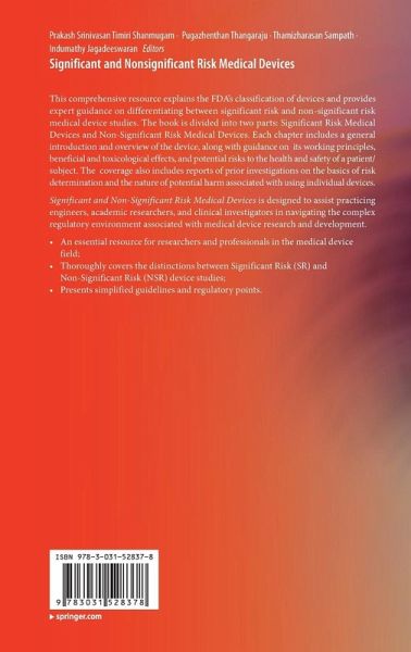 This comprehensive resource explains the FDA's classification of devices and provides expert guidance on differentiating between significant risk and non-significant risk medical device studies. The book is divided into two parts: Significant Risk Medical Devices and Non-Significant Risk Medical Devices. Each chapter includes a general introduction and overview of the device, along with guidance on its working principles, beneficial and toxicological effects, and potential risks to the health and safety of a patient/subject. The coverage also includes reports of prior investigations on the basics of risk determination and the nature of potential harm associated with using individual devices. Significant and Non-Significant Risk Medical Devices is designed to assist practicing engineers, academic researchers, and clinical investigators in navigating the complex regulatory environment associated with medical device research and development.