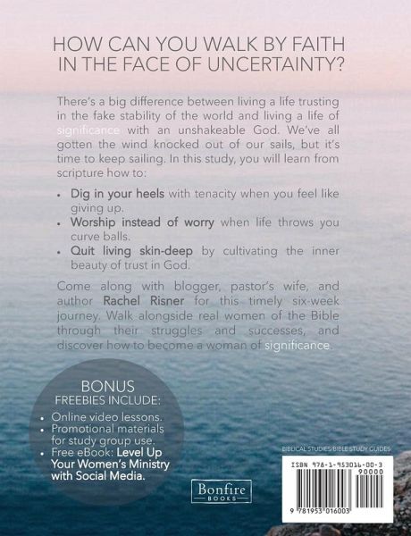 How can you walk by faith in the face of uncertainty? There's a big difference between living a life trusting in the fake stability of the world and living a life of significance with an unshakeable God. We've all gotten the wind knocked out of our sails, but it's time to keep going forward. In this study, learn from scripture how to:Dig in your heels with tenacity when you feel like giving up. Worship instead of worry when life throws you curve balls. Quit living skin-deep by cultivating the inner beauty of trust in God. Come along with pastor's wife and author Rachel Risner for this timely six-week journey. Walk alongside real women of the Bible through their struggles and successes, and discover how to become a woman of significance.