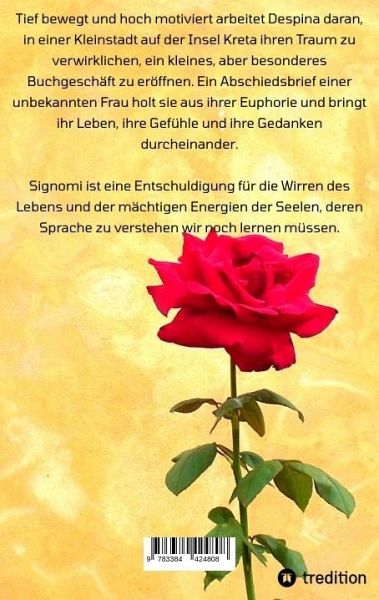 Signomi erzählt die Geschichte von Despina, die auf Kreta hoch motiviert einen kleinen Buchladen eröffnen möchte. Ein Abschiedsbrief einer Frau holt sie aus ihrer Eurphorie und versetzt sie in Zweifel und Unsicherheit. Sie lernt einen älteren Griechen kennen, der ihr hilft, mit der Situation besser zurüchtzukommen. Konflikte begleiten ihren Weg, der durch das Schicksal ungeahnte Wendungen nimmt. Despina findet Kraft für das Leben aus den Energien der Seelen ihrer Liebsten.