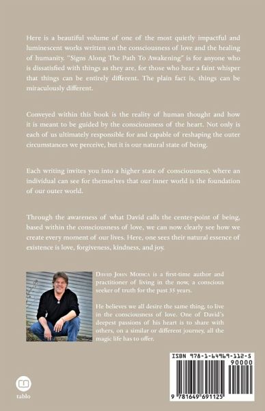 Here is a beautiful volume of one of the most quietly impactful and luminescent works written on the consciousness of love and the healing of humanity. "Signs Along The Path To Awakening" is for anyone who is dissatisfied with things as they are, for those who hear a faint whisper that things can be entirely different. The plain fact is, things can be miraculously different. Conveyed within this book is the reality of human thought and how it is meant to be guided by the consciousness of the heart. Not only is each of us ultimately responsible for and capable of reshaping the outer circumstances we perceive, but it is our natural state of being. Each writing invites you into a higher state of consciousness, where an individual can see for themselves that our inner world is the foundation of our outer world. Through the awareness of what David calls the center-point of being, based within the consciousness of love, we can now clearly see how we create every moment of our lives. Here, one sees their natural essence of existence is love, forgiveness, kindness, and joy.