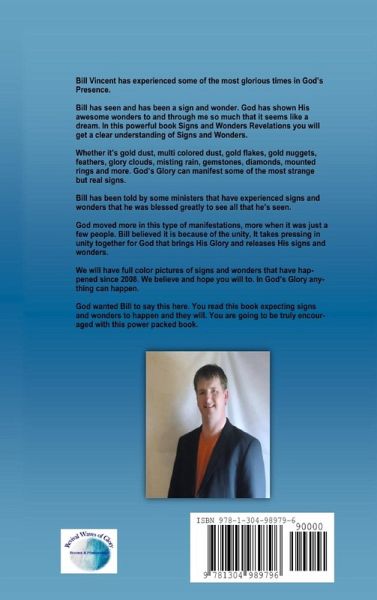 Bill Vincent has experienced some of the most glorious times in God's Presence. Bill has seen and has been a sign and wonder. God has shown His awesome wonders to and through me so much that it seems like a dream. In this powerful book Signs and Wonders Revelations you will get a clear understanding of Signs and Wonders. Whether it's gold dust, multi colored dust, gold flakes, gold nuggets, feathers, glory clouds, misting rain, gemstones, diamonds, mounted rings and more. God's Glory can manifest some of the most strange but real signs. Bill has been told by some ministers that have experienced signs and wonders that he was blessed greatly to see all that he's seen. God moved more in this type of manifestations, more when it was just a few people. Bill believed it is because of the unity, It takes pressing in unity together for God that brings His Glory and releases His signs and wonders. We will have full color pictures of signs and wonders that have happened since 2008. We believe and hope you will to. In God's Glory anything can happen. God wanted Bill to say this here. You read this book expecting signs and wonders to happen and they will. You are going to be truly encouraged with this power packed book.