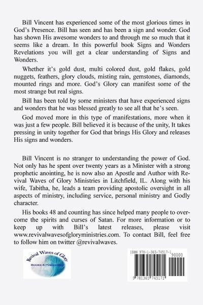 Bill Vincent has experienced some of the most glorious times in God's Presence. Bill has seen and has been a sign and wonder. God has shown His awesome wonders to and through me so much that it seems like a dream. In this powerful book Signs and Wonders Revelations you will get a clear understanding of Signs and Wonders. Whether it's gold dust, multi colored dust, gold flakes, gold nuggets, feathers, glory clouds, misting rain, gemstones, diamonds, mounted rings and more. God's Glory can manifest some of the most strange but real signs. Bill has been told by some ministers that have experienced signs and wonders that he was blessed greatly to see all that he's seen. God moved more in this type of manifestations, more when it was just a few people. Bill believed it is because of the unity, It takes pressing in unity together for God that brings His Glory and releases His signs and wonders.