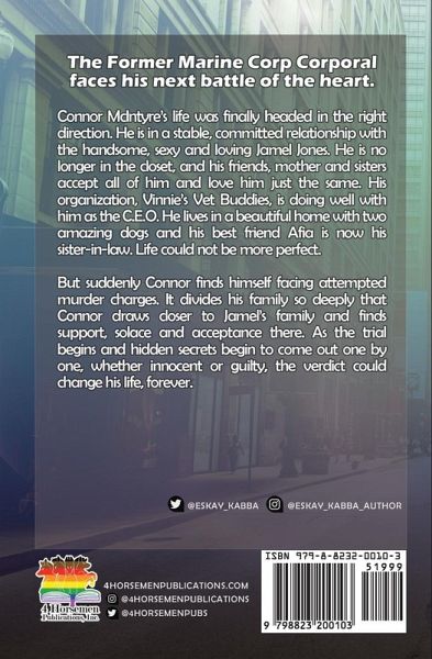 The Former Marine Corp Corporal faces his next battle of the heart. Connor McIntyre's life was finally headed in the right direction. He is in a stable, committed relationship with the handsome, sexy and loving Jamel Jones. He is no longer in the closet, and his friends, mother and sisters accept all of him and love him just the same. His organization, Vinnie's Vet Buddies, is doing well with him as the C.E.O. He lives in a beautiful home with two amazing dogs and his best friend Afia is now his sister-in-law. Life could not be more perfect. Suddenly Connor finds himself facing attempted murder charges. It divides his family so deeply that Connor draws closer to Jamel's family and finds support, solace, and acceptance there. As the trial begins and hidden secrets begin to come out one by one, whether innocent or guilty, the verdict could change his life, forever.