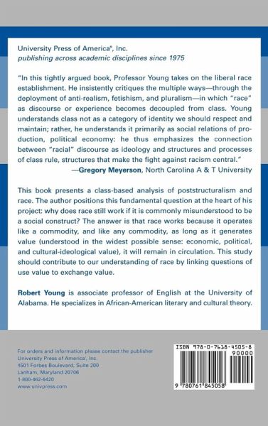 This book presents a class-based analysis of poststructuralism and race. The author positions this fundamental question at the heart of his project: why does race still work if it is commonly misunderstood to be a social construct?