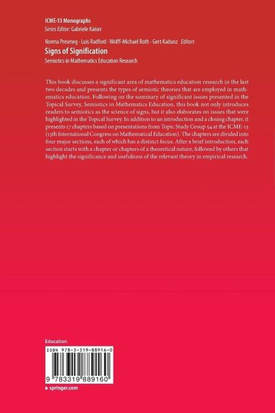 This book discusses a significant area of mathematics education research in the last two decades and presents the types of semiotic theories that are employed in mathematics education. Following on the summary of significant issues presented in the Topical Survey, Semiotics in Mathematics Education, this book not only introduces readers to semiotics as the science of signs, but it also elaborates on issues that were highlighted in the Topical Survey. In addition to an introduction and a closing chapter, it presents 17 chapters based on presentations from Topic Study Group 54 at the ICME-13 (13th International Congress on Mathematical Education). The chapters are divided into four major sections, each of which has a distinct focus. After a brief introduction, each section starts with a chapter or chapters of a theoretical nature, followed by others that highlight the significance and usefulness of the relevant theory in empirical research.