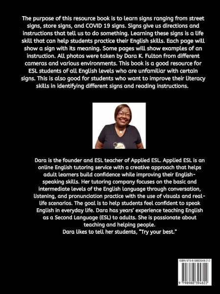 The purpose of this resource book is to learn signs ranging from street signs, store signs, and COVID 19 signs. Signs give us directions and instructions that tell us to do something. Learning these signs is a life skill that can help students practice their English skills. Each page will show a sign with its meaning. Some pages will show examples of an instruction. All photos were taken by Dara K. Fulton from different cameras and various environments. This book is a good resource for ESL students of all English levels who are unfamiliar with certain signs. This is also good for students who…mehr