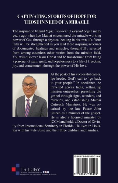 The inspiration behind Signs, Wonders & Beyond began many years ago when Ipe Mathai encountered the miracle-working power of God through a physical healing in his own life. Your faith will be strengthened as you read these inspiring accounts of documented healings and miracles, thoughtfully selected from among countless other stories from the mission field. You will discover Jesus Christ and be transformed from being a prisoner of pain, guilt, and hopelessness to a life of freedom, joy, and contentment through the power of His love.