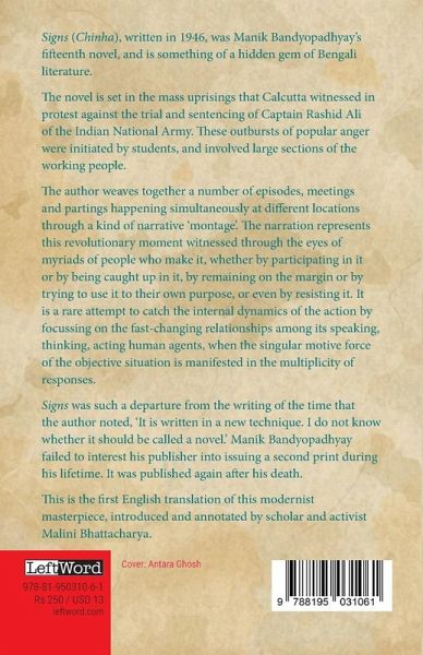 Signs (Chinha), written in 1946, was Manik Bandyopadhyay's fifteenth novel, and is something of a hidden gem of Bengali literature.The novel is set in the mass uprisings that Calcutta witnessed in protest against the trial and sentencing of Captain Rashid Ali of the Indian National Army. These outbursts of popular anger were initiated by students, and involved large sections of the working people.The author weaves together a number of episodes, meetings and partings happening simultaneously at different locations through a kind of narrative 'montage'. The narration represents this revolutionary moment witnessed through the eyes of myriads of people who make it, whether by participating in it or by being caught up in it, by remaining on the margin or by trying to use it to their own purpose, or even by resisting it. It is a rare attempt to catch the internal dynamics of the action by focussing on the fast-changing relationships among its speaking, thinking, acting human agents, when the singular motive force of the objective situation is manifested in the multiplicity of responses.Signs was such a departure from the writing of the time that the author noted, 'It is written in a new technique. I do not know whether it should be called a novel.' Manik Bandyopadhyay failed to interest his publisher into issuing a second print during his lifetime. It was published again after his death.This is the first English translation of this modernist masterpiece, introduced and annotated by scholar and activist Malini Bhattacharya.