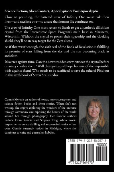 Close to perishing, the battered crew of Infinity One must risk their lives—and sacrifice one—to assure that human life continues on. The crew of Infinity One must return to Earth to get a synthetic dilithium crystal from the Intercosmic Space Program's main base in Marinette, Wisconsin. Without the crystal to power their spaceship and the cloaking shield, they'll be an easy target for the Zeta aliens. As if that wasn't enough, the sixth seal of the Book of Revelation is fulfilling its promise of stars falling from the sky and the sun becoming black as sackcloth. It's a race against time. Can the downtrodden crew retrieve the crystal before calamity crushes them? Will they give up all hope because of the impossible odds against them? Who needs to be sacrificed to save the others? Find out in this sixth book of Seven Seals Redux.