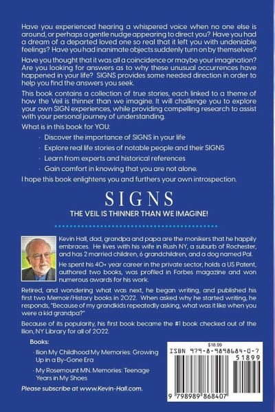 Have you experienced hearing a whispered voice when no one else is around, or perhaps a gentle nudge appearing to direct you? Have you had a dream of a departed loved one so real that it left you with undeniable feelings? Have you had inanimate objects suddenly turn on by themselves? Have you thought that it was all a coincidence or maybe your imagination? Are you looking for answers as to why these unusual occurrences have happened in your life? SIGNS provides some needed direction in order to help you find the answers you seek. This book contains a collection of true stories, each linked to a theme of how the Veil is thinner than we imagine. It will challenge you to explore your own SIGN experiences, while providing compelling research to assist with your personal journey of understanding. What is in this book for YOU:Discover the importance of SIGNS in your life Explore real life stories of notable people and their SIGNS Learn from experts and historical references Gain comfort in knowing that you are not alone. I hope this book enlightens you and furthers your own introspection.