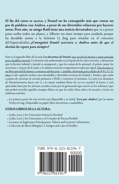 El fin del curso se acerca, y Daniel no ha conseguido más que cruzar un par de palabras con Andrea, a pesar de sus divertidos esfuerzos por hacerse notar. Peor aún, su amigo Raúl tiene una noticia devastadora que va a poner patas arriba todos sus planes, y Alberto no tiene tiempo para ayudarle porque ha decidido unirse a la listísima Li Jing para triunfar en el concurso del Supercalculón. ¿Conseguirá Daniel acercarse a Andrea antes de que el destino los separe para siempre? Este es el segundo libro de la serie Los desatinos de Daniel, una novela de humor y amor pensada para el público juvenil. La historia está ambientada en la España de los años noventa, y demuestra que la ficción infantil y juvenil es atemporal, y que los temas de la amistad, el primer amor, las travesuras y el paso de la niñez a la adolescencia los compartimos todos por igual. Esta lectura es un libro juvenil de humor y romance adolescente / cándido, destinada para edades de 8-9 a 11-12 años. Cada capítulo incluye una entrañable y divertida aventura de Daniel y Andrea, que están a punto de terminar la escuela primaria o EGB y comenzar el instituto. La serie Los desatinos de Daniel promete hacer reír (y a lo mejor también llorar de vez en cuando) al lector, y será apreciada tanto por los jóvenes actuales como por la generación que creció en los ochenta y que aún podrá recordar aquellos tiempos felices en que los niños iban solos a la escuela y vivían sin teléfonos móviles.La primera parte de esta novela está disponible y se titula "Loco por Andrea", por la autora Evelyn Irving.