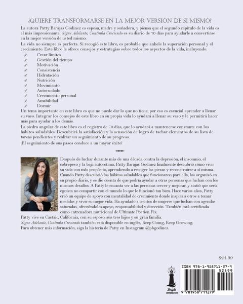 ¿Quiere transformarse en la mejor versión de sí mismo? La autora Patty Barajas Godinez es esposa, madre y soñadora, y piensa que el segundo capítulo de la vida es el más impresionante. Sigue Adelante, Continúa Creciendo es su diario de 70 días para ayudarle a convertirse en la mejor versión de usted mismo. La vida no siempre es perfecta. Si recogió este libro, es probable que anhele la superación personal y el crecimiento. Este libro le ofrece consejos y estrategias sobre todos los aspectos de la vida, incluyendo: ¿ Crear límites ¿ Gestión del tiempo ¿ Motivación ¿ Consistencia ¿ Hidratación ¿ Nutrición ¿ Movimiento ¿ Autocuidado ¿ Crecimiento personal ¿ Amabilidad ¿ Dormir Un tema importante en este libro es que no puede dar lo que no tiene, por eso es esencial aprender a llenar su vaso. Integrar los consejos de este libro en su propia vida lo ayudará a llenar su vaso y le permitirá hacer más para ayudar a los demás. La piedra angular de este libro es el registro de 70 días, que lo ayudará a mantenerse constante con los hábitos saludables. Descubrirá la satisfacción y la sensación de logro de tachar elementos de su lista de tareas pendientes y realizar un seguimiento de su progreso. ¡El seguimiento de sus pasos conduce a un mayor éxito!
