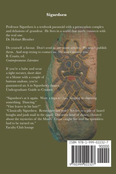 Professor Sigurdsen is a textbook paranoid with a persecution complex and delusions of grandeur. He lives in a world that rarely connects with the real one. Dr. Hobart Blember. Do yourself a favour. Don't send us any more articles. We won't publish them. And stop trying to contact us. We won't answer you. B. Coutts, ed., Contemporaneous Literature If you're a babe and wear a tight sweater, short skirt or a blouse with a couple of buttons undone, you're guaranteed an A in Sigurdsen's classes. Undergraduate Guide to Courses "Sigurdsen's at it again. Wore a toga to class. Singing or chanting something. Dancing." "Vine leaves in his hair?" "Classically Sigurdsen. Remember last year? Set fire to a pile of laurel boughs and junk mail in the quad. Did some kind of dance, chanted about the mysteries of the muses. Grass caught fire and the sprinklers had to be turned on." Faculty Club lounge