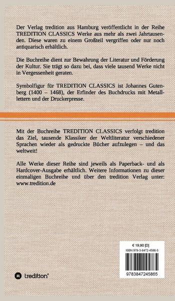 Diese Hardcover-Ausgabe ist Teil der TREDITION CLASSICS. Der Verlag tredition aus Hamburg veröffentlicht in der Buchreihe TREDITION CLASSICS Werke aus mehr als zwei Jahrtausenden. Diese waren zu einem Großteil vergriffen oder nur noch antiquarisch erhältlich. Mit TREDITION CLASSICS verfolgt tredition das Ziel, tausende Klassiker der Weltliteratur verschiedener Sprachen wieder als gedruckte Bücher zu verlegen und das weltweit! Die Buchreihe dient zur Bewahrung der Literatur und Förderung der Kultur. Sie trägt so dazu bei, dass viele tausend Werke nicht in Vergessenheit geraten.