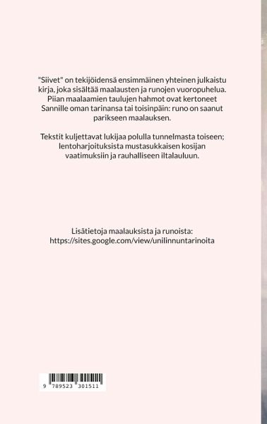 "Siivet" on tekijöidensä ensimmäinen yhteinen julkaistu kirja, joka sisältää maalausten ja runojen vuoropuhelua. Piian maalaamien taulujen hahmot ovat kertoneet Sannille oman tarinansa tai toisinpäin: runo on saanut parikseen maalauksen. Tekstit kuljettavat lukijaa polulla tunnelmasta toiseen; lentoharjoituksista mustasukkaisen kosijan vaatimuksiin ja rauhalliseen iltalauluun. Lisätietoja maalauksista ja runoista: https://sites.google.com/view/unilinnuntarinoita