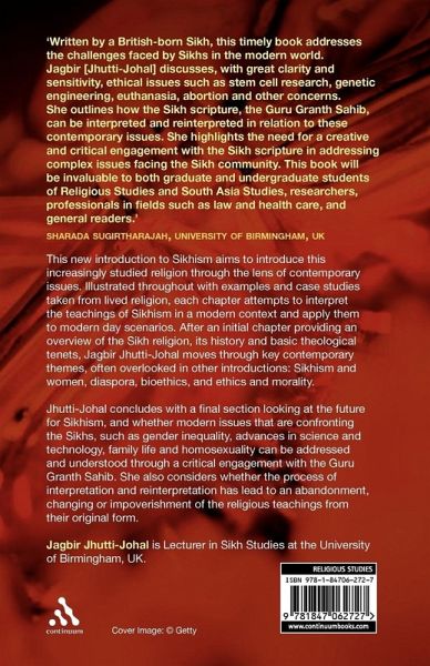 This new introduction to Sikhism aims to introduce this increasingly studied religion through the lens of contemporary issues. Illustrated throughout with examples and case studies taken from lived religion, each chapter attempts to interpret the teachings of Sikhism in a modern context and apply them to modern day scenarios. After an initial chapter providing an overview of the Sikh religion, its history and basic theological tenets, Jagbir Jhutti-Johal moves through key contemporary themes, often overlooked in other introductions: Sikhism and women, science and bioethics, and ethics and morality. She concludes with a final section looking at the future for Sikhism, and whether modern issues that are confronting the Sikhs, such as gender inequality, advances in science and technology, family life and homosexuality can be addressed and understood through a critical engagement with the Guru Granth Sahib. She will also consider whether the process of interpretation and reinterpretation has lead to an abandonment, changing or impoverishment of the religious teachings from their original form.