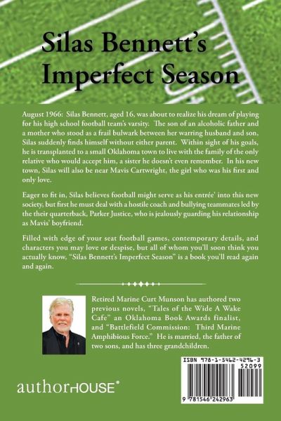 August 1966: Silas Bennett, aged 16, was about to realize his dream of playing for his high school football teams varsity. The son of an alcoholic father and a mother who stood as a frail bulwark between her warring husband and son, Silas suddenly finds himself without either parent. Within sight of his goals, he is transplanted to a small Oklahoma town to live with the family of the only relative who would accept him, a sister he doesnt even remember. In his new town, Silas will also be near Mavis Cartwright, the girl who was his first and only love. Eager to fit in, Silas believes football might serve as his entre into this new society, but first he must deal with a hostile coach and bullying teammates led by the their quarterback, Parker Justice, who is jealously guarding his relationship as Mavis boyfriend. Filled with edge of your seat football games, contemporary details, and characters you may love or despise, but all of whom youll soon think you actually know, Silas Bennetts Imperfect Season is a book youll read again and again.