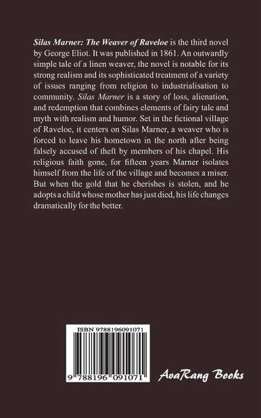 Silas Marner: The Weaver of Raveloe is the third novel by George Eliot. It was published in 1861. An outwardly simple tale of a linen weaver, the novel is notable for its strong realism and its sophisticated treatment of a variety of issues ranging from religion to industrialisation to community. Silas Marner is a story of loss, alienation, and redemption that combines elements of fairy tale and myth with realism and humor. Set in the fictional village of Raveloe, it centers on Silas Marner, a weaver who is forced to leave his hometown in the north after being falsely accused of theft by members of his chapel. His religious faith gone, for fifteen years Marner isolates himself from the life of the village and becomes a miser. But when the gold that he cherishes is stolen, and he adopts a child whose mother has just died, his life changes dramatically for the better.