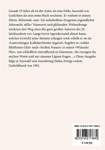 Gerade 19 Jahre alt ist der Autor als eine frühe Auswahl von Gedichten als sein erstes Buch erscheint. Er widmet es seinen Eltern. Rührende, zum Teil unbeholfene Zeugnisse jugendlicher Sehnsucht, stiller Träumerei und glühenden Weltendrangs zeichnen den Weg eines der ganz großen Autoren des 20. Jahrhunderts vor. Lange bevor irgendjemand ahnen kann, welches Gewicht seine Stimme erlangen wird, erhebt er sie im "Lustverlangen kraftdurchtoster Jugend", begehrt in "wilder Rhythmen Glut" nach "heißen Frauen" in seiner "Wünsche Flut", um schließlich entwaffnend zu bekennen: "Es verzagen die reichen Worte und nur stumme Lippen fragen ..." Diese Ausgabe folgt in Auswahl und Anordnung Stefan Zweigs erstem Gedichtband von 1901.