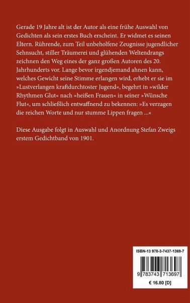 Gerade 19 Jahre alt ist der Autor als eine frühe Auswahl von Gedichten als sein erstes Buch erscheint. Er widmet es seinen Eltern. Rührende, zum Teil unbeholfene Zeugnisse jugendlicher Sehnsucht, stiller Träumerei und glühenden Weltendrangs zeichnen den Weg eines der ganz großen Autoren des 20. Jahrhunderts vor. Lange bevor irgendjemand ahnen kann, welches Gewicht seine Stimme erlangen wird, erhebt er sie im "Lustverlangen kraftdurchtoster Jugend", begehrt in "wilder Rhythmen Glut" nach "heißen Frauen" in seiner "Wünsche Flut", um schließlich entwaffnend zu bekennen: "Es verzagen die reichen Worte und nur stumme Lippen fragen ..." Diese Ausgabe folgt in Auswahl und Anordnung Stefan Zweigs erstem Gedichtband von 1901.