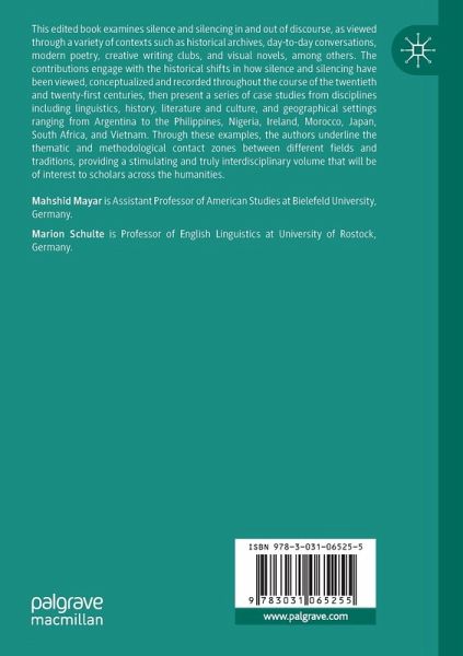 Chapter 1. Silences in History, Linguistics, and Literature: An Introduction (Mahshid Mayar and Marion Schulte).- Chapter 2. Towards an Ontology of Silence in Music (Johannes Voit).- Chapter 3. Linguistic Considerations on the Awkward Silence (Simon Betz).- Chapter 4. Dissonant Silence: Susan Sontag and the Aesthetics of Silence (Ulf Olsson).- Chapter 5. Talkative and Taciturn Nations: Ethnographic and Political Perspectives in European Discourses on Communicative Cultures (c. 1750-1850) (Theo Jung).- Chapter 6. Corpus-Linguistic and Cultural-Cognitive Perspectives on Silence in Black South African English (Arne Peters).- Chapter 7. Organic Archives and Generative Silence: A Case Study of The Nlele Institute's Photographic Archives (Erin Dickey and Carol Magee).- Chapter 8. Voices in a Silenced Archive: The Photographs of the Menage Scientific Expedition (Mark Rice).- Chapter 9. Silence as Masquerade: Punctuation, Prosody, and Performance in 'A Primer for the Punctuation of Heart Disease' (Mahshid Mayar).- Chapter 10. The Hatred of Speech and the Poetics of Silence (Thomas Gould).- Chapter 11. Night and Silence: Five Breaths at the End of the World (Jason Bahbak Mohaghegh).- Chapter 12. No Quiet Place - Breaking the Silence, Speaking the Unspeakable, or: How Cultural Critique Thrives on a Paradox (Sabine Sielke).- Chapter 13. Frankenstein's Resounding Silence on Industrialisation: An Ecocritical Reading of the Novel's Production and Reception (Ellen Grünkemeier).- Chapter 14. "No noise of any kind" - Silence and Silencing in First World War Correspondence (Frauke Griese).- Chapter 15. The Body Without Organs: On Silencing the Self (Steven Bindeman).- Chapter 16. The Silences and Silencing of First Languages Among L2 Speakers of English in Ireland (Marion Schulte).- Chapter 17. Silencing the Winning Opposition: An Irish Pre-Election Interview (Bettina Migge)