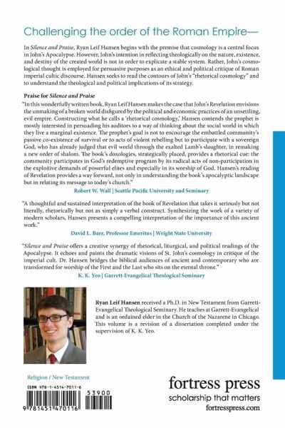 In Silence and Praise, Ryan Leif Hansen begins with the premise that cosmology is a central focus in Johns Apocalypse. However, Johns intention in reflecting theologically on the nature, existence, and destiny of the created world is not in order to explicate a stable system. Rather, Johns cosmological thought is employed for persuasive purposes as an ethical and political critique of Roman imperial cultic discourse. Hansen seeks to read the contours of Johns rhetorical cosmology and to understand the theological and political implications of its strategy.