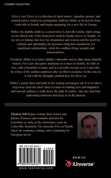 Silence and Sirens is a collection of short stories, vignettes, poems, and journal entries written by protagonist Anthony Miller as he travels from Louisville to Seattle and then begins to prepare for a new life in Europe. Miller, the middle child in a conservative Louisville family, finds refuge on the liberal side of his hometown until he finally moves to Seattle. As he tries to balance his love for stimulation and women and his need for solitude and spirituality, his passions bring him tumultuous yet significant relationships, while his conflicts bring insights and transcendence. Decadent, Miller is at times affably vulnerable and at other times brutally honest. For a few deceptive moments on a street in Seattle, he falls in love with a beautiful woman; and in a novella excerpt set in Louisville, he writes of his sudden repulsion after an illicit encounter. In the end, he is left with his thoughts, printed here for all to see. Miller's poetic lines and truth in his writing encourages all of us to take a step away from the ideal when it comes to finding love and happiness and instead embrace a walk down the path of reality-the rare and truly captivating moments that keep us in the present.