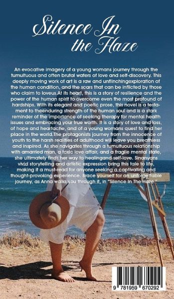 An evocative imagery of a young woman's journey through the tumultuous and often brutal waters of love and self-discovery. This deeply moving work of art is a raw and unflinching exploration of the human condition, and the scars that can be inflicted by those who claim to love us.At its heart, this is a story of resilience and the power of the human spirit to overcome even the most profound of hardships. With its elegant and poetic prose, this novel is a testament to the enduring strength of the human soul and is a stark reminder of the importance of seeking therapy for mental health issues and embracing your true worth. It is a story of love and loss, of hope and heartache, and of a young woman's quest to find her place in the world.The protagonist's journey from the innocence of youth to the harsh realities of adulthood will leave you breathless and inspired. As she navigates through a tumultuous relationship with a married man, a toxic love affair, and a fragile mental state, she ultimately finds her way to healing and self-love. Sinanyan's vivid storytelling and artistic expression bring this tale to life, making it a must-read for anyone seeking a captivating and thought-provoking experience.Brace yourself for an unforgettable journey, as Anna walks you through it , in "Silence In The Haze."