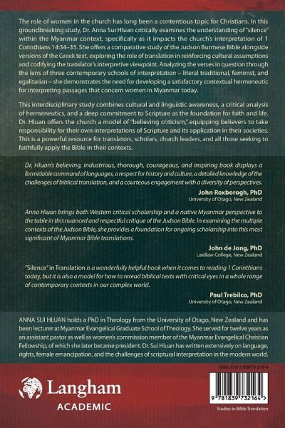 The role of women in the church has long been a contentious topic for Christians. In this groundbreaking study, Dr. Anna Sui Hluan critically examines the understanding of "silence" within the Myanmar context, specifically as it impacts the church's interpretation of 1 Corinthians 14:34-35. She offers a comparative study of the Judson Burmese Bible alongside versions of the Greek text, exploring the role of translation in reinforcing cultural assumptions and codifying the translator's interpretive viewpoint. Analyzing the verses in question through the lens of three contemporary schools of interpretation - literal traditional, feminist, and egalitarian - she demonstrates the need for developing a satisfactory contextual hermeneutic for interpreting passages that concern women in Myanmar today. This interdisciplinary study combines cultural and linguistic awareness, a critical analysis of hermeneutics, and a deep commitment to Scripture as the foundation for faith and life. Dr. Hluan offers the church a model of "believing criticism," equipping believers to take responsibility for their own interpretations of Scripture and its application in their societies. This is a powerful resource for translators, scholars, church leaders, and all those seeking to faithfully apply the Bible in their contexts.