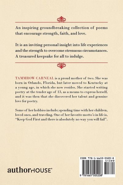 An inspiring groundbreaking collection of poems that encourage strength, faith, and love. It is an inviting personal insight into life experiences and the strength to overcome strenuous circumstances. A treasured keepsake for all to indulge.