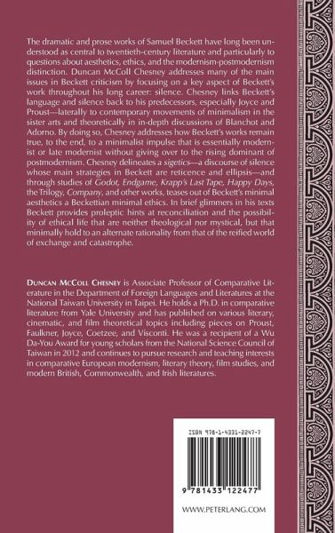 The dramatic and prose works of Samuel Beckett have long been understood as central to twentieth-century literature and particularly to questions about aesthetics, ethics, and the modernism-postmodernism distinction. Duncan McColl Chesney addresses many of the main issues in Beckett criticism by focusing on a key aspect of Beckett's work throughout his long career: silence. Chesney links Beckett's language and silence back to his predecessors, especially Joyce and Proust - laterally to contemporary movements of minimalism in the sister arts and theoretically in in-depth discussions of Blanchot and Adorno. By doing so, Chesney addresses how Beckett's works remain true, to the end, to a minimalist impulse that is essentially modernist or late modernist without giving over to the rising dominant of postmodernism. Chesney delineates a sigetics - a discourse of silence whose main strategies in Beckett are reticence and ellipsis - and through studies of Godot, Endgame, Krapp's Last Tape, Happy Days, the Trilogy, Company, and other works, teases out of Beckett's minimal aesthetics a Beckettian minimal ethics. In brief glimmers in his texts Beckett provides proleptic hints at reconciliation and the possibility of ethical life that are neither theological nor mystical, but that minimally hold to an alternate rationality from that of the reified world of exchange and catastrophe.