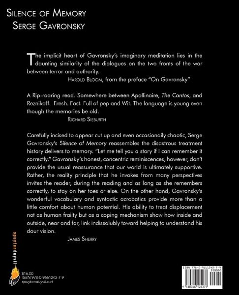 Poetry. "The implicit heart of Gavronsky's imaginary meditation lies in the daunting similarity of the dialogues on the two fronts of the war between terror and authority." Harold Bloom, from the preface "A rip-roaring read. Somewhere between Apollinaire, The Cantos, and Reznikoff. Fresh. Fast. Full of pep and wit. The language is young even though the memories be old." Richard Sieburth "Carefully incised to appear cut up and even occasionally chaotic, Serge Gavronsky's SILENCE OF MEMORY reassembles the disastrous treatment history delivers to memory. 'Let me tell you a story if I can remember it correctly.' Gavronsky's honest, concentric reminiscences, however, don't provide the usual reassurance that our world is ultimately supportive. Rather, the reality principle that he invokes from many perspectives invites the reader, during the reading and as long as she remembers correctly, to stay on her toes or else. On the other hand, Gavronsky's wonderful vocabulary and syntactic acrobatics provide more than a little comfort about human potential. His ability to treat displacement not as human frailty but as a coping mechanism show how inside and outside, near and far, link indissolubly toward helping to understand his dour vision." James Sherry"