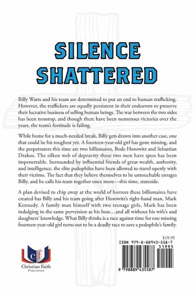 Billy Watts and his team are determined to put an end to human trafficking. However, the traffickers are equally persistent in their endeavors to preserve their lucrative business of selling human beings. The war between the two sides has been nonstop, and though there have been numerous victories over the years, the team's fortitude is failing. While home for a much-needed break, Billy gets drawn into another case, one that could be his toughest yet. A fourteen-year-old girl has gone missing, and the perpetrators this time are two billionaires, Bode Horowitz and Sebastian Drakos. The silken web of depravity these two men have spun has been impenetrable. Surrounded by influential friends of great wealth, authority, and intelligence, the elite pedophiles have been allowed to travel openly with their victims. The fact that they believe themselves to be untouchable enrages Billy, and he calls his team together once more--this time, stateside. A plan devised to chip away at the world of horrors these billionaires have created has Billy and his team going after Horowitz's right-hand man, Mark Kennedy. A family man himself with two teenage girls, Mark has been indulging in the same perversion as his boss...and all without his wife's and daughters' knowledge. What Billy thinks is a race against time for one missing fourteen-year-old girl turns out to be a deadly race to save a pedophile's family.