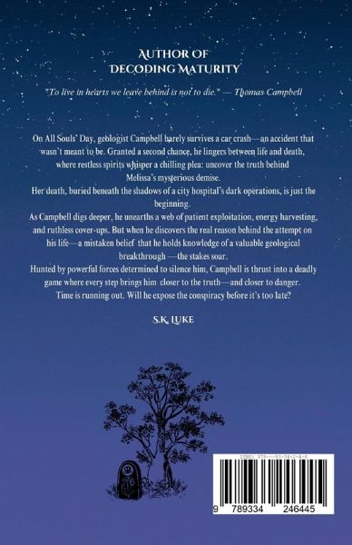 "To live in hearts, we leave behind is not to die." - Thomas CampbellGenre: Thriller, Paranormal, Mystery."The Silence Whispers: All Souls Day"When geologist Campbell survives a near-fatal car accident on All Souls' Day, he is granted a second chance-it was not yet his time. As he briefly transcends into the afterlife, restless spirits beg him to uncover the truth behind the mysterious death of young Melissa, a victim of the city hospital's sinister operations. The enigma surrounding her demise is a puzzle that will keep you captivated.Returned to the world of the living and bound by his promise to the departed, Campbell is determined to expose the truth. With the support of his allies, he treads a dangerous path, uncovering patient exploitation, energy harvesting, and a web of cover-ups.His investigation takes a startling turn when he discovers the actual reason behind his attempted assassination-a mistaken belief that he possessed knowledge of a valuable geological breakthrough despite having no such awareness at the time.As Campbell delves deeper into Melissa's tragic fate and the motives behind the attempt on his life, he finds himself ensnared in a perilous conspiracy. Powerful forces will stop at nothing to keep their secrets buried. Outmatched and overwhelmed, he realises he is entangled in a web far beyond his control, facing an ordeal that may cost him everything.Will Campbell survive long enough to expose the conspiracy and bring those responsible to justice? Uncover the secrets behind Melissa's untimely death and the attempt on his life in this gripping mystery.