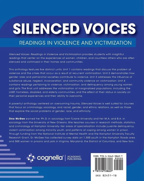 Silenced Voices: Readings in Violence and Victimization provides students with insightful readings that center on the experiences of women, children, and countless others who are often silenced and victimized in their homes and communities. This anthology features five distinct units. Unit 1 contains readings that discuss the problem of violence and the crises that occur as a result of recurrent victimization. Unit 2 demonstrates how gender roles and patriarchal societies contribute to violence. Unit 3 addresses the influence of substance abuse, neglect, incarceration, and community violence on victimization. Unit 4 contains readings pertaining to violence, victimization, and delinquency among young women and girls. The final unit addresses the victimization of marginalized populations, including the LGBT, homeless, disabled, and elderly communities, and the effect of their status in society on their personal experiences and their ability to overcome. A powerful anthology centered on overcoming trauma, Silenced Voices is well suited for courses that focus on criminology, sociology, and racial, gender, and ethnic relations, as well as those that explore the social problems of gender, race, and ethnicity. Zina McGee earned her Ph.D. in sociology from Tulane University and her M.A. and B.A. in sociology from the University of New Orleans. She teaches courses in research methods, statistics, and criminology at Hampton University. Her areas of specialization include juvenile delinquency, violent victimization among minority youth, and patterns of coping among women in prison. Through funding from the National Institute of Mental Health and the Hampton University Faculty Research Grant, Dr. McGee has collected survey data on 1,500 youth in the Hampton Roads area and 500 women in prisons and jails in Virginia, Maryland, the District of Columbia, and New York.