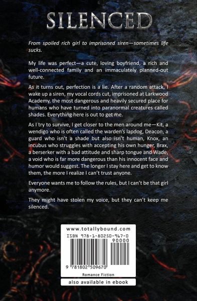 From spoiled rich girl to imprisoned siren-sometimes life sucks. My life was perfect-a cute, loving boyfriend, a rich and well-connected family and an immaculately planned-out future. As it turns out, perfection is a lie. After a random attack, I wake up to discover I've turned into a siren, had my vocal cords cut and am now imprisoned at Larkwood Academy, the most dangerous and heavily secured place for humans who have turned into paranormal creatures called shades. Everything here is out to get me-the warden, the guards and even the other shades. As I try to survive, I get closer to the men around me-Kit, a wendigo who is often called the warden's lapdog, Deacon, a guard who isn't a shade but also isn't human, Knox, an incubus who struggles with accepting his own hunger, Brax, a berserker with a bad attitude and sharp tongue and Wade, a void who is far more dangerous than his innocent face and humor would suggest. The longer I stay here and get to know them, the more I realize I can't trust anyone. Everyone wants me to follow the rules, but I can't be that girl anymore. They might have stolen my voice, but they can't keep me silenced.