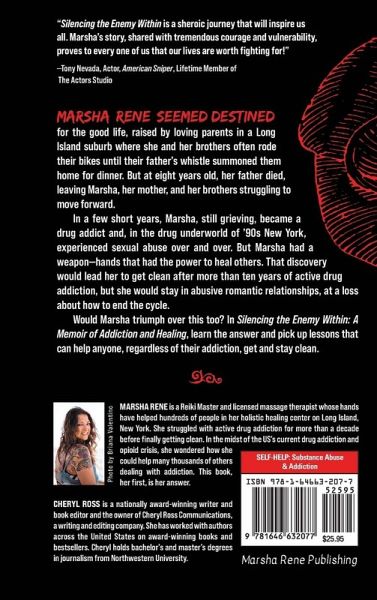 Marsha Rene seemed destined for the good life, raised by loving parents in a Long Island suburb where she and her brothers often rode their bikes until their father's whistle summoned them home for dinner. But at eight years old, her father died, leaving Marsha, her mother, and her brothers struggling to move forward. In a few short years, Marsha, still grieving, became a drug addict and, in the drug underworld of '90s New York, experienced sexual abuse over and over. But Marsha had a weapon-hands that had the power to heal others. That discovery would lead her to get clean after more than ten years of active drug addiction, but she would stay in abusive romantic relationships, at a loss about how to end the cycle. Would Marsha triumph over this too? In Silencing the Enemy Within: A Memoir of Addiction and Healing, learn the answer and pick up lessons that can help anyone, regardless of their addiction, get and stay clean.