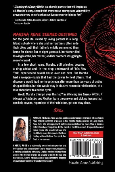 Marsha Rene seemed destined for the good life, raised by loving parents in a Long Island suburb where she and her brothers often rode their bikes until their father's whistle summoned them home for dinner. But at eight years old, her father died, leaving Marsha, her mother, and her brothers struggling to move forward. In a few short years, Marsha, still grieving, became a drug addict and, in the drug underworld of '90s New York, experienced sexual abuse over and over. But Marsha had a weapon-hands that had the power to heal others. That discovery would lead her to get clean after more than ten years of active drug addiction, but she would stay in abusive romantic relationships, at a loss about how to end the cycle. Would Marsha triumph over this too? In Silencing the Enemy Within: A Memoir of Addiction and Healing, learn the answer and pick up lessons that can help anyone, regardless of their addiction, get and stay clean.