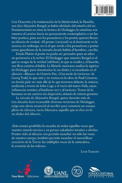 Con Descartes y la instauración de la Modernidad, la filosofía, nos dice Alejandra Rangel, se había olvidado del estudio del ser. Fundamentada en años de lectura de Heidegger, la estudiosa nos muestra el camino hacia un pensamiento contemplativo y un habitar poético, pues son los pensadores y los poetas quienes llenan su silencio de verdad: «El pensar (racional) es el dominante en la ciencia; sin embargo, no es el que revela a los pensadores y poetas como guardianes de la morada donde habita el hombre», escribe. Desde Platón el poeta no podía ser pensador pues su saber no pertenecía a la techné. El Heidegger que muestra Rangel es el que se ocupa de la verdad (alétheia), la que se oculta y, al hacerlo, nos lleva camino al habla. La filósofa mexicana analiza la sigética de Heidegger para desentrañar lo no dicho y sí escuchado en el silencio: «Blanco» de Octavio Paz, «Una tarde de invierno» de Georg Trakl, lo que está y no vemos en la obra de Paul Cézanne, en donde pide ver más allá de lo que tenemos delante, la música, analizada a través de John Cage y el vacío del teatro Nôh, cuyas influencias remiten al budismo zen y al taoismo. Trazos de lo humano en un camino sin dispersión, dotado de interés genuino. La mirada de Alejandra Rangel, quien durante más de tres décadas leyó incansable diversas versiones de Heidegger, exige una alerta sensorial al escribir para nosotros un ensayo pleno de silencio, vacío, blancura, aquello que se dice en lo no dicho del silencio.
