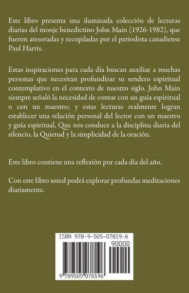 Este libro presenta una iluminada colección de lecturas diarias del monje benedictino John Main (1926-1982), que fueron atesoradas y recopiladas por el periodista canadiense Paul Harris. Estas inspiraciones para cada día buscan auxiliar a muchas personas que necesitan profundizar su sendero espiritual contemplativo en el contexto de nuestro siglo. John Main siempre señaló la necesidad de contar con un guía espiritual o con un maestro; y estas lecturas realmente logran establecer una relación personal del lector con un maestro y guía espiritual, Que nos conduce a la disciplina diaria del silencio, la Quietud y la simplicidad de la oración. Este libro contiene una reflexión por cada día del año. Con este libro usted podrá explorar profundas meditaciones diariamente.