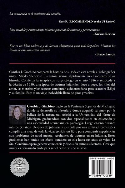 Cynthia J. Giachino comparte la historia de su vida en esta novela autobiográfica única, Miedo Silencioso. La autora avanza rápidamente en el recuento de su historia. Comienza la terapia con su psicólogo en el año 1986 y retrocede a la década de 1950, una época de traumas infantiles. Poco a poco, los hilos del amor, las mentiras y los secretos comienzan a desentrañarse para la autora (Lilly) y su familia. Este es un viaje inolvidable lleno de giros y vueltas.