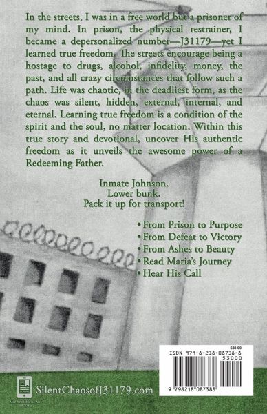 In the streets, I was in a free world, but a prisoner of my mind. In prison, the physical restrainer, I became a depersonalized number--- J31179---yet I learned true freedom. The streets encourage being a hostage to drugs, alcohol, infidelity, money, the past, and all crazy circumstances follow such a path. Life was chaotic, in the deadliest form, as the Chaos was silent, hidden, external, internal, and eternal. Learning true freedom is a condition of the Spirit and the soul, no matter location. Within this true story and devotional, uncover His authentic freedom as it unveils the awesome power of a Redeeming Father. Inmate Johnson. Lower bunk. Pack it up for transport! * From Prison to Purpose * From Defeat to Victory * From Ashes to Beauty * Read Maria's Journey * Hear His Call