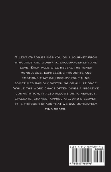 Silent Chaos, a collection of poetry and prose, brings you on a journey from struggle and worry to encouragement and love. Each page will reveal the inner monologue, expressing thoughts and emotions that can occupy your mind, sometimes rapidly switching or all at once. While the word chaos often gives a negative connotation, it also allows us to reflect, evaluate, change, appreciate, and discover. It is through chaos that we can ultimately find order.