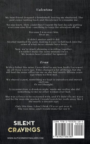Valentina My best friend dropped a bombshell, leaving me shattered. The past came rushing back and threatened to consume me. No one knew. How could they? I spent the last decade putting everyone else first. Anything to keep the attention off me. Because I was over him. Over us. It didn't matter until it did. Alcohol numbed the pain, making it easy to fall back into the arms of what never should have been. Now, we're stuck planning a wedding together. I wouldn't make the same mistake twice. My broken heart couldn't be ignored. Evan With a father like mine, I was blind to see how badly I screwed up all those years ago. Time changed a lot of things, but she still had the same effect on me as she had nearly fifteen years ago when we first met. We shared a past, something we kept to ourselves and moved on from. Or so I thought. A reconnection, a drunken night, made me realize she did something to me no other woman ever had. She was a force to be reckoned with, and if I didn't fix my ways and be the man she needed, I would watch her walk away like I did nearly a decade ago. Only this time, I don't think I'll ever get over it. She was mine, and I would make her see it. Triggers: Pregnancy Loss