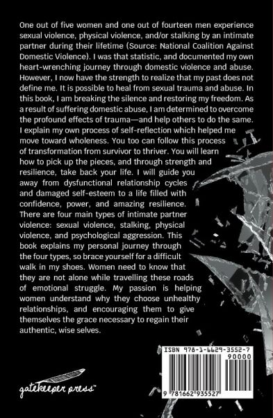 One out of five women and one out of fourteen men experience sexual violence, physical violence and/or stalking by an intimate partner during their lifetime. (National Coalition Against Domestic Violence) I was that statistic, and documented my own heart-wrenching journey through domestic violence and abuse. However, I now have the strength to realize that my past does not define me. It is possible to heal from sexual trauma and abuse. In this book, I am breaking the silence and restoring my freedom. As a result of suffering domestic abuse, I am determined to overcome the profound effects of trauma-and help others to do the same. I explain my own process of self-reflection which helped me move toward wholeness. You too can follow this process of transformation from survivor to thriver. You will learn how to pick up the pieces of your life and through strength and resilience, take back your life. I will guide you away from dysfunctional relationship cycles and damaged self-esteem to a life filled with confidence, power, and amazing resilience. There are four main types of intimate partner violence: sexual violence, stalking, physical violence, and psychological aggression. This book explains my personal journey through the four types so brace yourself for a difficult walk in my shoes. Women need to know that they are not alone while travelling these roads of emotional struggle. My newfound passion is helping women understand why they pick unhealthy relationships, give themselves the grace to move on, and regain their authentic, wise selves.