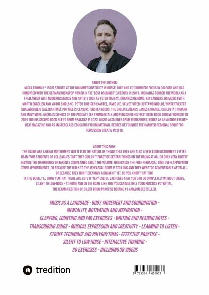 SILENT DRUM PRACTICE Practicing Drums without Drums - at Home ad on the Road (#1 Amazon Bestseller in Germany)The drums are a great instrument, but it is in the nature of things that they are also a very loud instrument. I often hear from students or colleagues that they couldn't practise certain things on the drums at all or only very briefly because the neighbours or parents complained about the volume. Or because the free rehearsal time overlapped with other appointments, or because the walk to the rehearsal room is too long and they were too comfortable after all. Or because they don't even own a drum kit yet. Do you know that too?In this book, I'll show you that there are lots of very useful exercises that you can do completely without drums. Noiseless to low-noise - at home or on the go. The interactive book contains 30 exercises with 38 videos on topics such as:-Clapping and counting exercises-Writing and reading notes-Transcribing songs-Musical expression and creativity-Learning to listen-The imaginary drum kit-Structured practising-Motivation and inspiration-Pad exercises-Mental practising-Stroke technique and polyrhythms