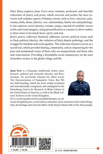 Silent Ebony explores Jesse Yaw's most intimate, profound, and heartfelt collections of poetry and prose, which unravels and probes the most intricate and complex aspects of human nature, such as love, rejection, pain, trauma, faith, abuse, identity, war, relationships, family ties and pathology. It also explores racial injustice, trauma, using a myriad of carefully woven tactile and visual imagery, using personification as a means to allow readers to draw close to his mind, heart, spirit, and soul. Jesse's poetry collection fearlessly addresses current political issues such as black political identity, the violation of black female pathology, and the struggle for freedom and racial equality. The collection of poetry serves as a sacred text, which provides healing, community, and an outpouring for the pure and unashamed voices of those who are marginalised, and those who seek rejuvenation. Providing a formidable social commentary on the state of modern society in the global village and life. Jesse Yaw is a Ghanaian intellectual, writer, poet, investor, political and economic theorist, and Businessman. He previously released his debut novel, The Deconstruction of Humanity's Voice, But We Are Still Standing, which has been widely acclaimed and internationally recognised, and catalogued in the Schomburg Centre for Research in Black Culture in the United States of America, as well as the Black Cultural Archives in the United Kingdom. He is a racial equality activist and philanthropist, an advocate for global peace, social reform, and justice. Jesse was born in the United Kingdom, his heritage sewn into the fabric of the Royal Ashanti tribe of the Akan people.