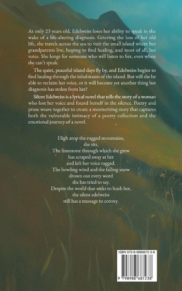 At only 23 years old, Edelweiss loses her ability to speak in the wake of a life-altering diagnosis. Grieving the loss of her old life, she travels across the sea to visit the small island where her grandparents live, hoping to find healing, and most of all, her voice. She longs for someone who will listen to her, even when she can't speak. The quiet, peaceful island days fly by, and Edelweiss begins to find healing through the inhabitants of the island. But will she be able to reclaim her voice, or it will become yet another thing her diagnosis has stolen from her? Silent Edelweiss is a lyrical novel that tells the story of a woman who lost her voice and found herself in the silence. Poetry and prose weave together to create a mesmerizing story that captures both the vulnerable intimacy of a poetry collection and the emotional journey of a novel. High atop the rugged mountains, she sits. The limestone through which she grew has scraped away at her and left her voice ragged. The howling wind and the falling snow drown out every word she has tried to say. Despite the world that seeks to hush her, the silent edelweiss still has a message to convey.