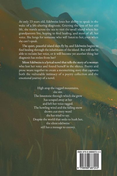 At only 23 years old, Edelweiss loses her ability to speak in the wake of a life-altering diagnosis. Grieving the loss of her old life, she travels across the sea to visit the small island where her grandparents live, hoping to find healing, and most of all, her voice. She longs for someone who will listen to her, even when she can't speak. The quiet, peaceful island days fly by, and Edelweiss begins to find healing through the inhabitants of the island. But will she be able to reclaim her voice, or will it become yet another thing her diagnosis has stolen from her? Silent Edelweiss is a lyrical novel that tells the story of a woman who lost her voice and found herself in the silence. Poetry and prose weave together to create a mesmerizing story that captures both the vulnerable intimacy of a poetry collection and the emotional journey of a novel. High atop the rugged mountains, she sits. The limestone through which she grew has scraped away at her and left her voice ragged. The howling wind and the falling snow drown out every word she has tried to say. Despite the world that seeks to hush her, the silent edelweiss still has a message to convey.